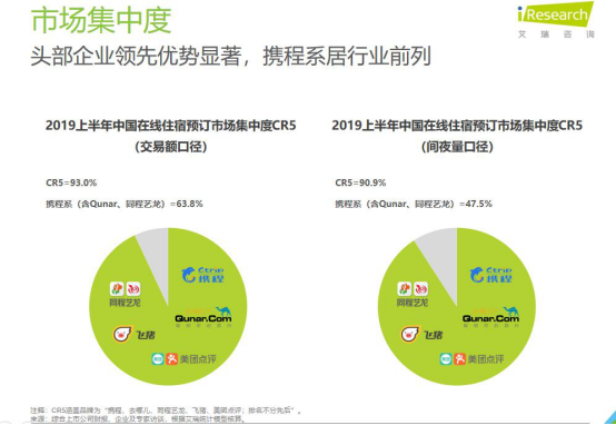 近日,国内老牌数据调研公司,成立17年的艾瑞发布《2019中国在线住宿预订行业研究报告》。报告显示,2019年中国在线住宿预订市场交易额预计超2700亿元,间夜规模预计达9.6亿间夜。在“市场集中度”CR5中(备注:CRn指数,即业内前N家头部企业所占市场份额的总和。艾瑞统计了“携程、去哪儿、同程艺龙、飞猪、美团点评”5大企业集中率,后文简称CR5),携程系交易额口径占63.8%,间夜量口径占47.5%,均超过CR5总量的一半,继续超越美团等行业对手,稳坐第一把交椅。