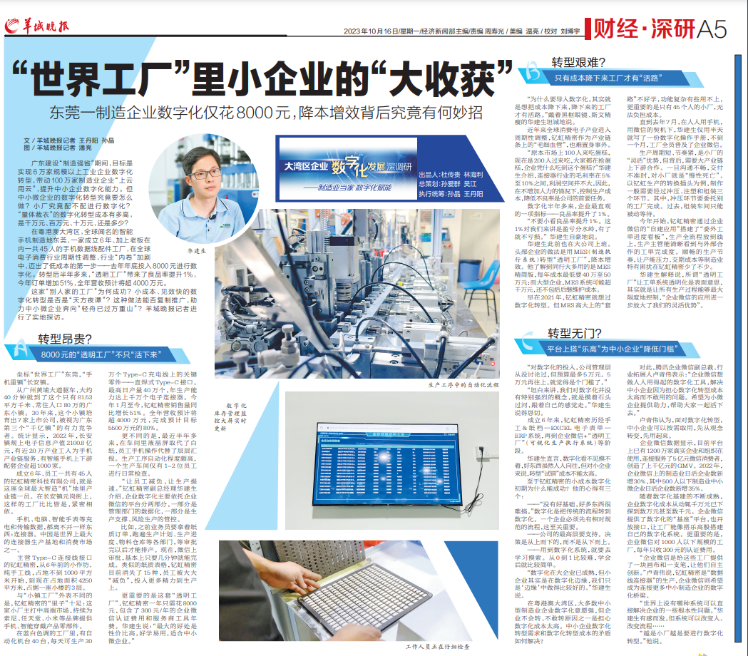 在粤港澳大湾区,全球闻名的智能手机制造地东莞,一家成立6年、加上老板在内一共45人的手机数据线配件工厂,在全球电子消费行业周期性调整,行业“内卷”加剧中,迈出了低成本的第一步——去年年底投入8000元进行数字化。转型后半年多来,“透明工厂”带来了良品率提升1%,今年订单增加51%,全年营收预计将超4000万元。