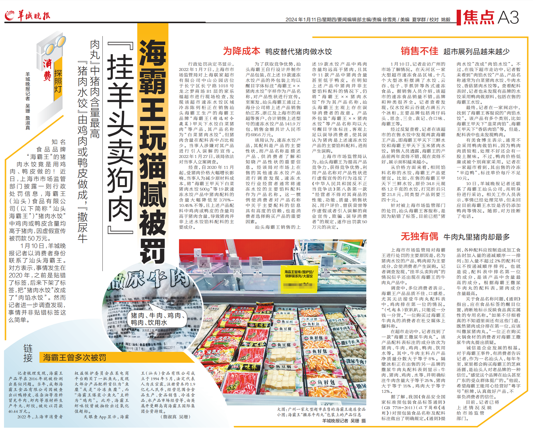 1月10日,羊城晚报记者以消费者身份联系了汕头海霸王。对方表示,事情发生在2020年,之前是贴错了标签,后来下架了标签,把“猪肉水饺”改成了“肉馅水饺”。然而记者进一步调查发现,事情并非贴错标签这么简单。