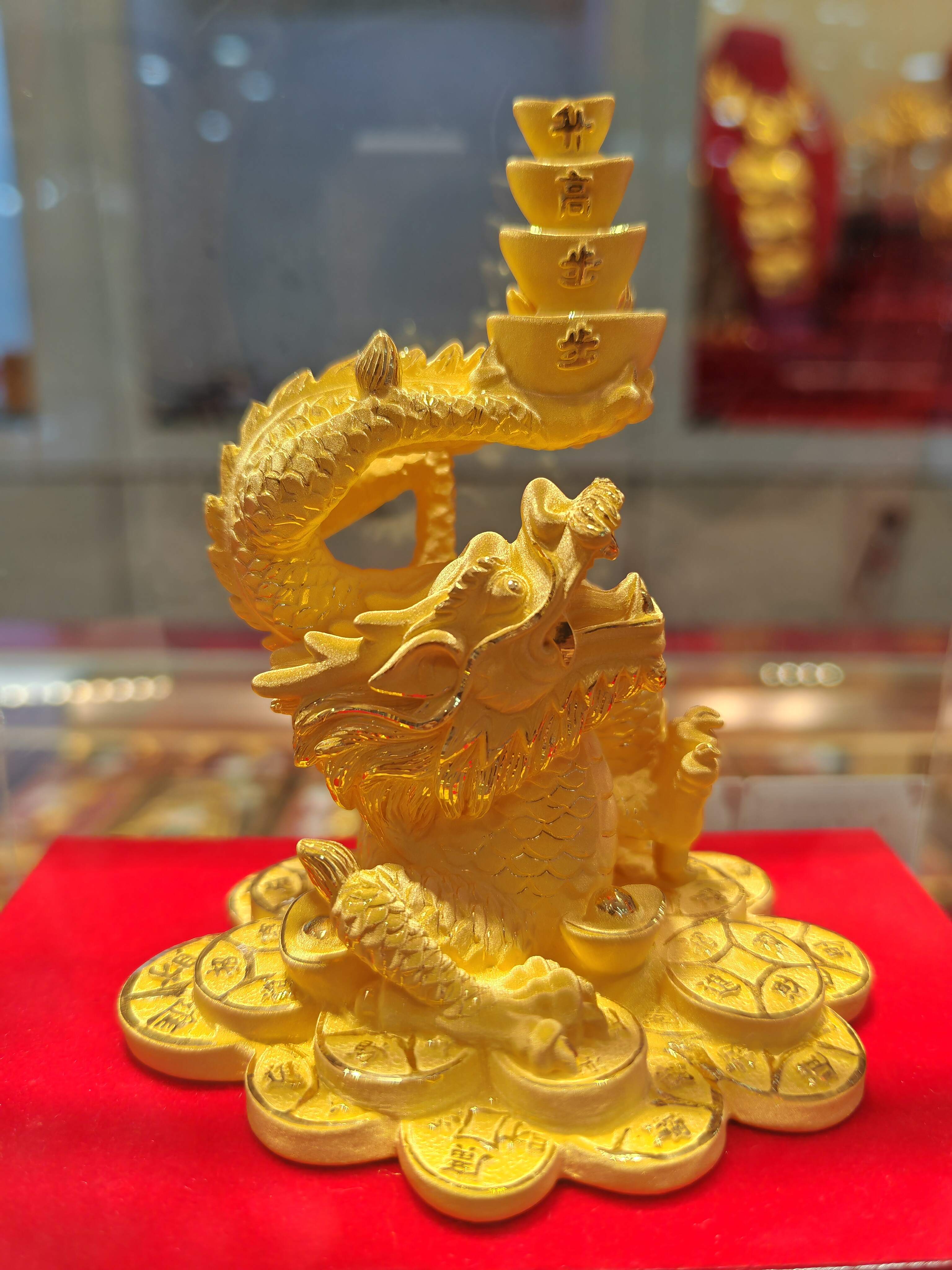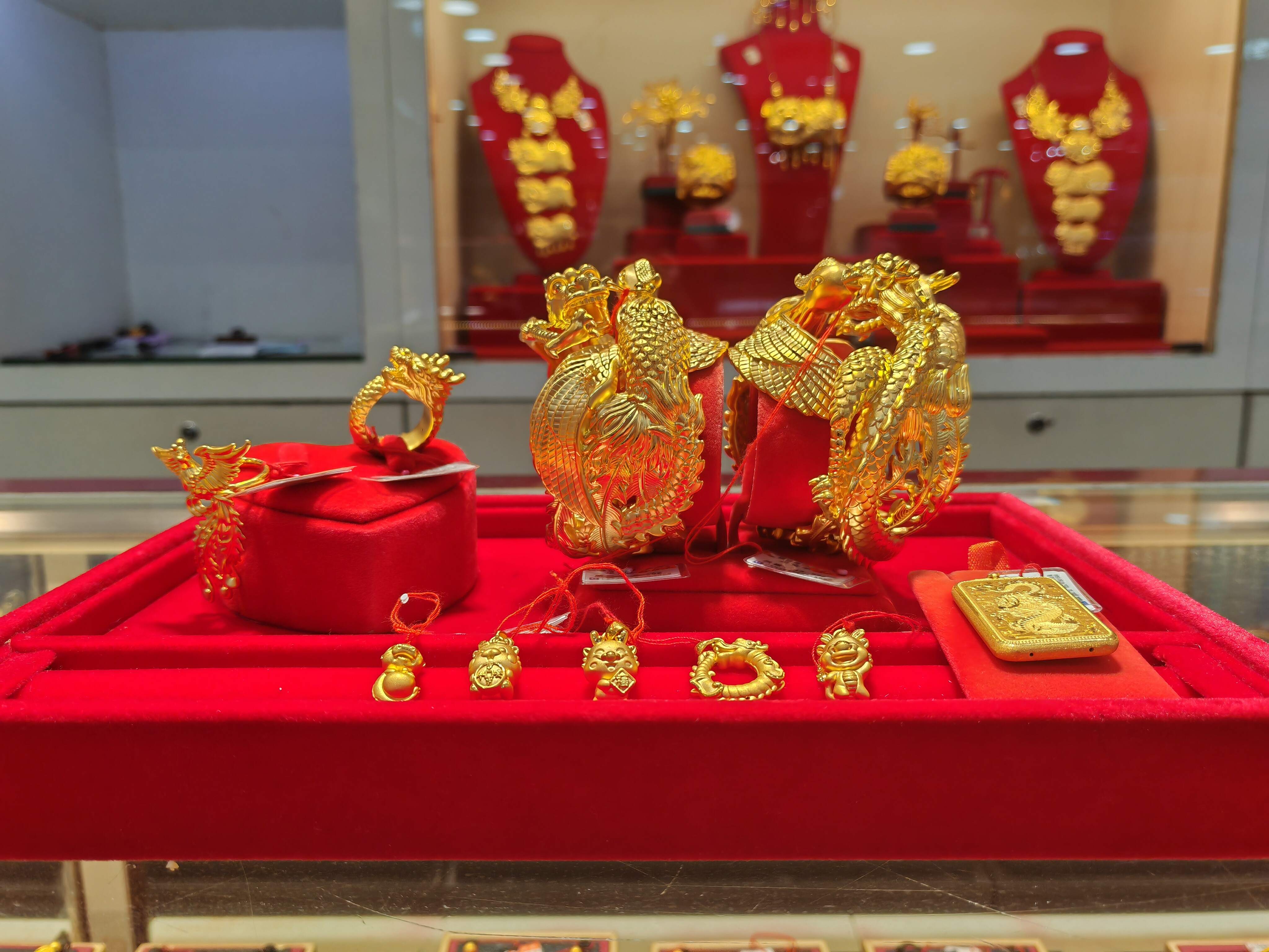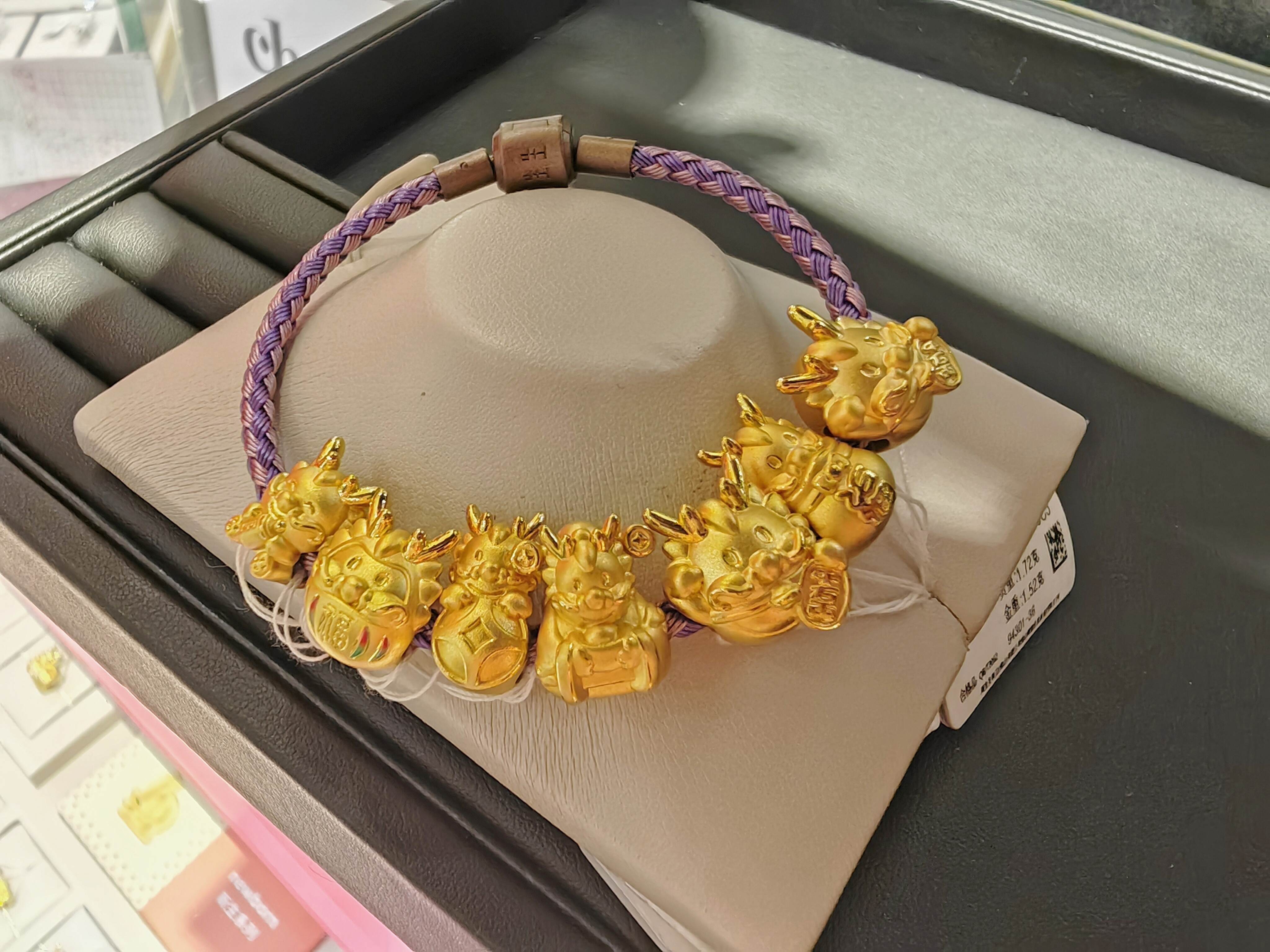 与此同时,这些商家都不约而同地把栩栩如生、造型各异的龙摆件放在对外展示的玻璃橱窗,生肖龙相关的转运珠、压岁钱金片、龙吊坠等小克重的黄金商品则放在了店内的中间柜台。