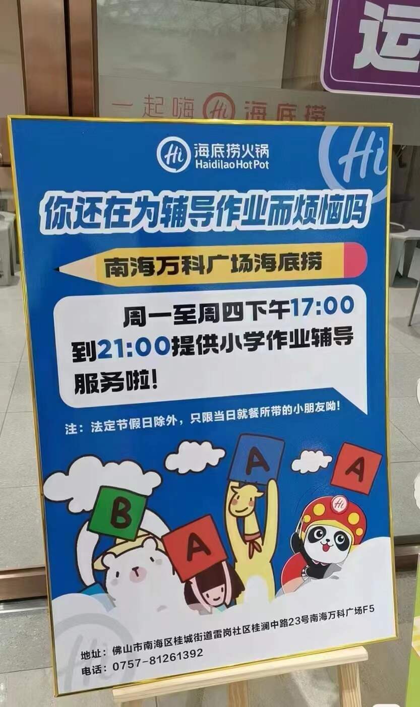 海底捞卷起来了,连学而思都害怕!如果带孩子吃火锅,店员能够帮孩子辅导作业,你愿意吗?日前,佛山一家海底捞门店的海报引爆社交平台。海报上显示“周一至周四下午17:00到21:00提供小学作业辅导服务”。这样的服务是否真的存在?羊城晚报全媒体记者拨打了门店的电话,有当班店员回应称,海报是真的存在,但是不存在辅导作业的服务,但是“如果带着孩子就餐,我们可以帮忙照看。”