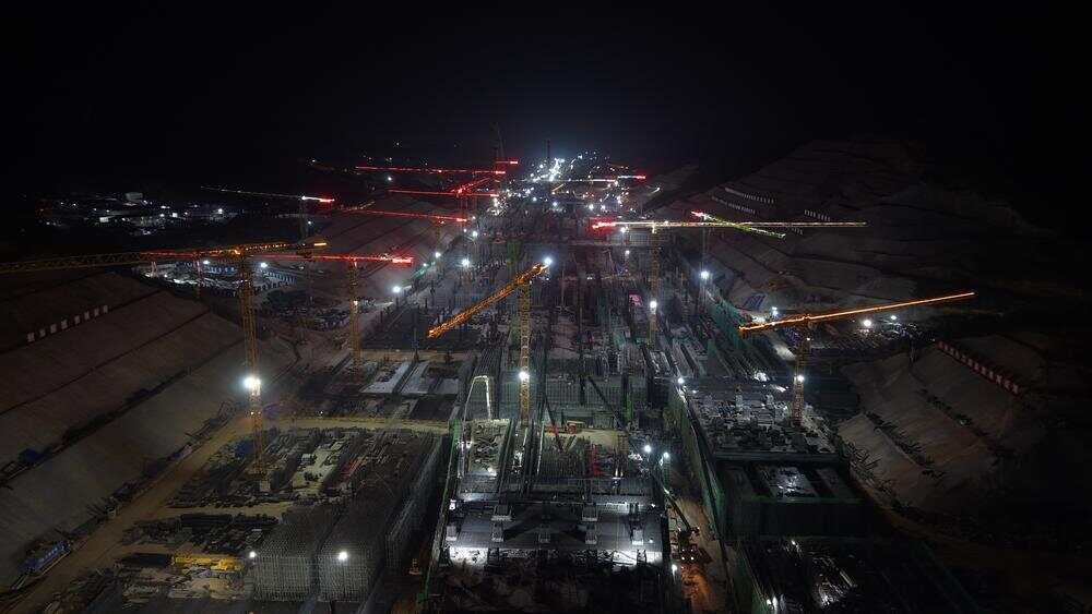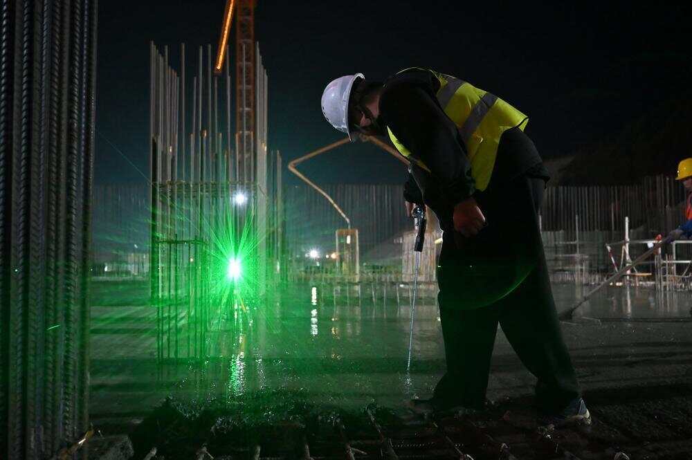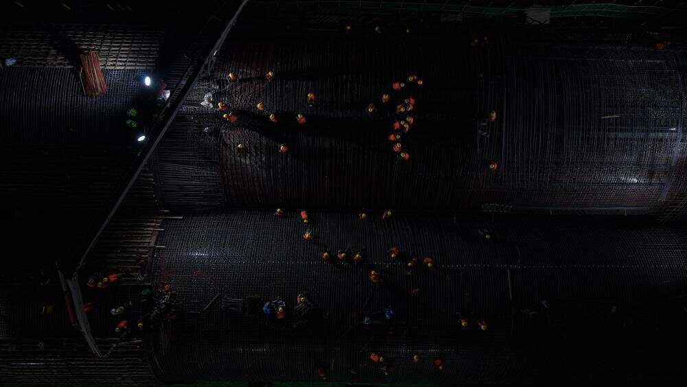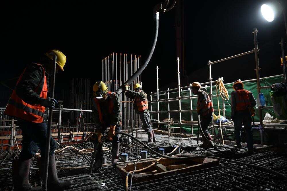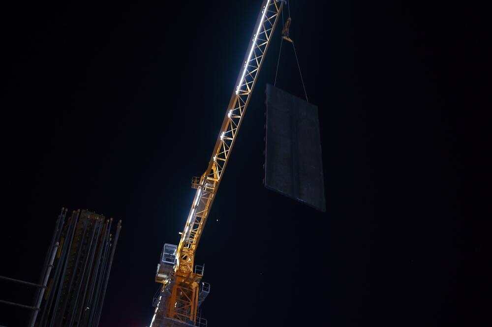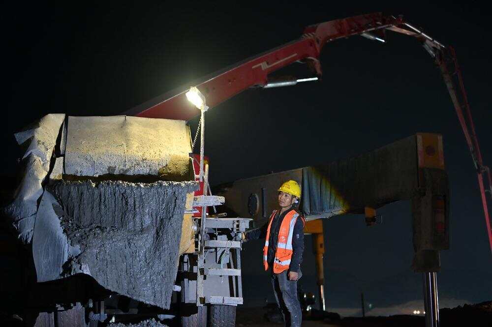 “夜间施工如同在钢筋舞台上跳舞。”站前15标项目经理郭少广站在其中一段施工完成的作业面上向记者解释这项特殊挑战。在照明灯的照射下,记者看到施工人员配备了安全绳、头灯与反光背心。黑夜之中,能见度问题得以解决,项目方投入的以大功率LED灯组为主的照明设备功不可没。