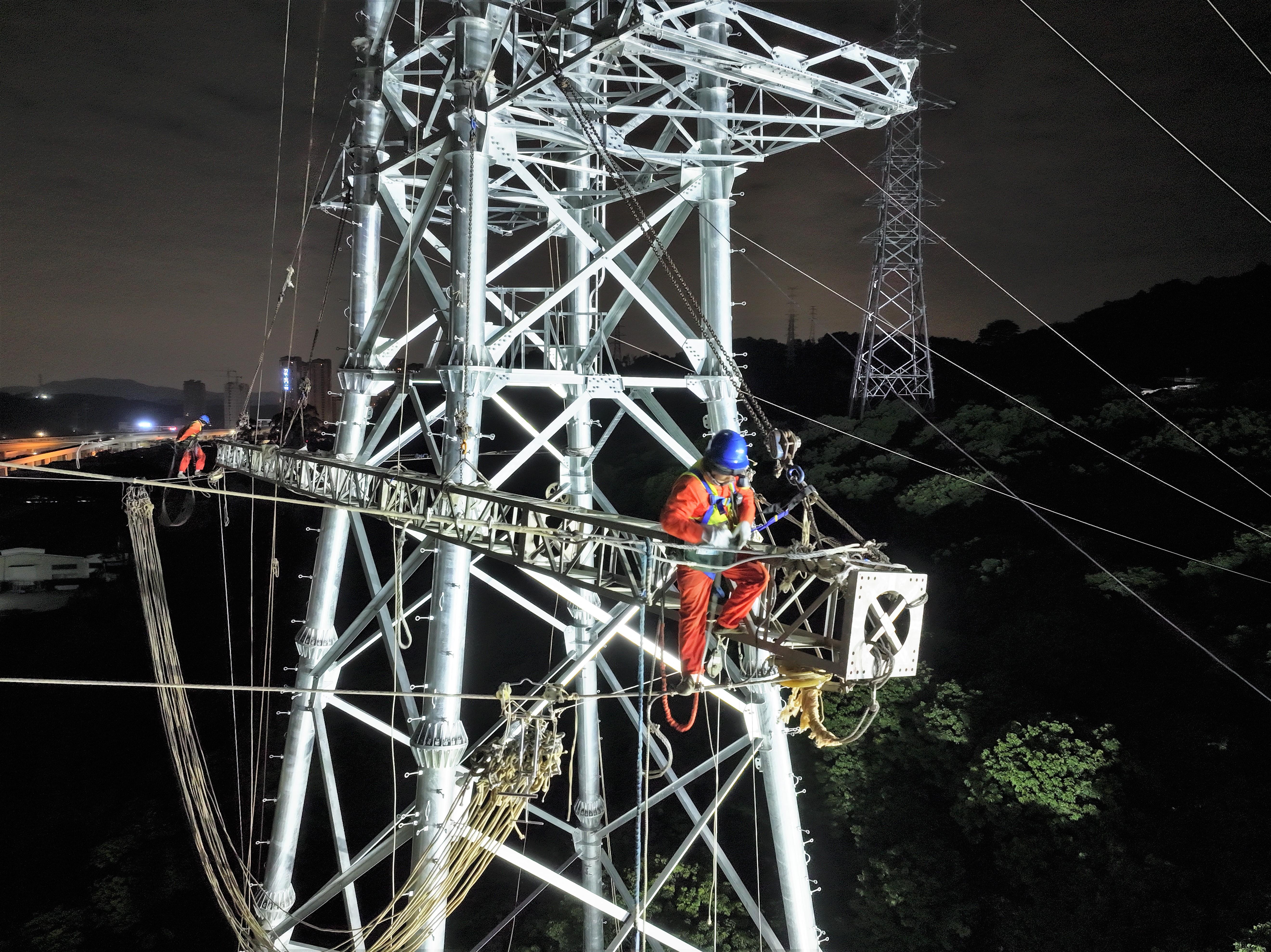 寒夜中施工现场灯火通明,施工人员在塔架与导线间忙碌,各流程无缝衔接、零差错推进。27岁青年团员曾誉,连续数月扎根现场,1月16日办完婚礼次日便返岗。“180分钟窗口期,每一分钟都关乎进度,我必须守在这里。”曾誉说。最终他和团队高效完成11个“天窗期”攻坚。
