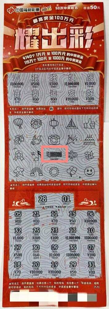 “当时看到桌面上剩下3张面值50元的‘耀出彩’刮刮乐,我买了其中2张,刮开第一张没有中奖,接着刮第二张,中了50元。我就用这中奖的50元买下最后那张‘耀出彩’彩票,心想就算不中也为公益作了贡献。”正是这份从容随缘的心态,为她带来了意想不到的惊喜——当她刮开第三张“耀出彩”的玩法区时,出现了“¥1000000”,百万大奖惊喜来临。