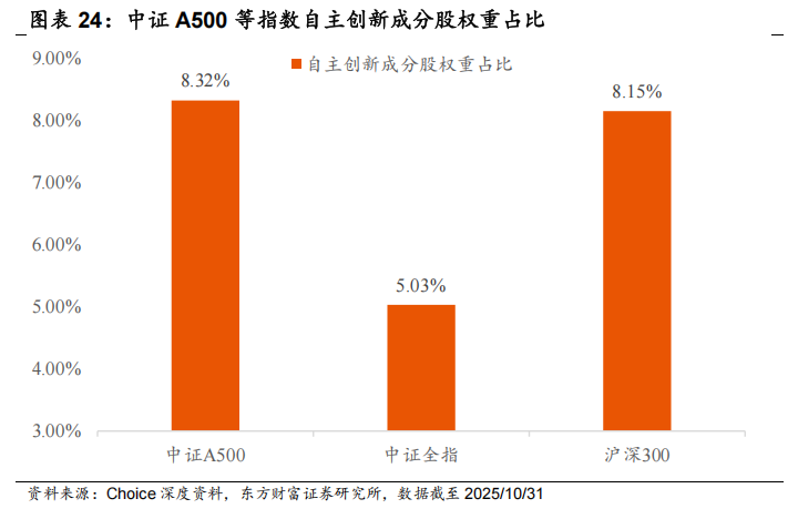 中证A500指数不仅覆盖广、权重散、行业风格均衡,并体现新质生产力特征,其在电子、电力设备、医药、国防军工等新兴产业相较沪深300指数显著超配,在金融、主要消费等传统行业权重占比显著降低,能够更集中地反映经济增长新动能的发展态势。为了应对全球竞争带来的挑战,中证A500深度参与到国家科技自立自强进程中,指数自主可控成分股占比权重约8.32%,远高于中证全指的5.03%。
