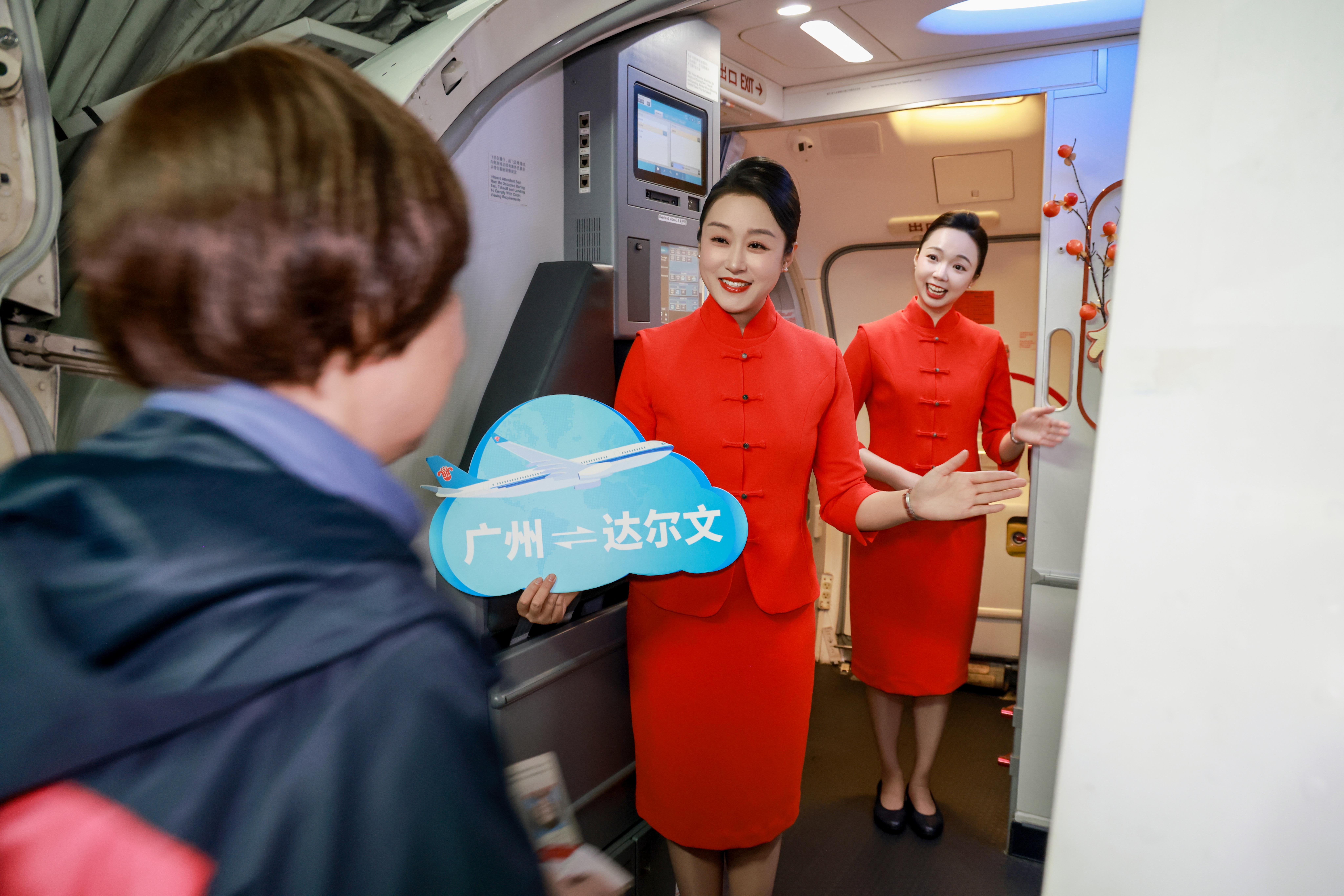 本次首航航班,南航选派技术精湛、经验深厚的精英机组执飞,提前深入研究达尔文机场特性、航路细节,针对地形与气象特点做足应对预案。客舱装饰以“福韵岭南”为主题,通过布置“福”字暖光灯配锦鲤装饰、木棉花灯串、祥云行李架贴纸、“喜上眉梢”装饰灯,将岭南元素与中式祝福融入航程,为旅客带来独特的乘机体验。
