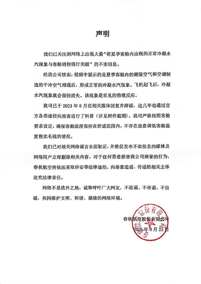 春秋航空还提到,公司已于2023年8月在相关媒体回复并辟谣,这几年也通过官方各类途径向旅客进行了科普。公司严格按照客舱要求设定,确保客舱温度保持在舒适范围内,不存在故意调低客舱温度售卖毛毯的情况。