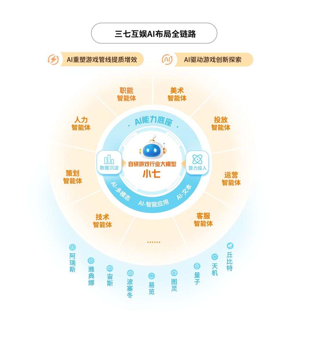 通过持续进行内部训练与推理优化,三七互娱自主研发游戏领域行业大模型“小七”,并基于“小七”及引入行业先进的外部大模型集群,构建40余种AI能力,构建“小七”智能体平台,覆盖市场分析/产品立项/美术设计/开发辅助/广告投放/运营分析/智能客服/通用办公等各业务领域。
